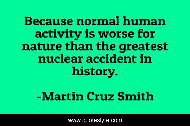 This page presents the quote "Because normal human activity is worse for nature than the greatest nuclear accident in history.". Author of this quote is Martin Cruz Smith. This quote is about nature, nuclear, nuclear-war, earth, humanity, pollution,.