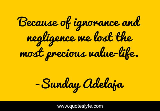 This page presents the quote "Because of ignorance and negligence we lost the most precious value-life.". Author of this quote is Sunday Adelaja. This quote is about because, negligence, lost, ignorance, value-life, most, precious,.