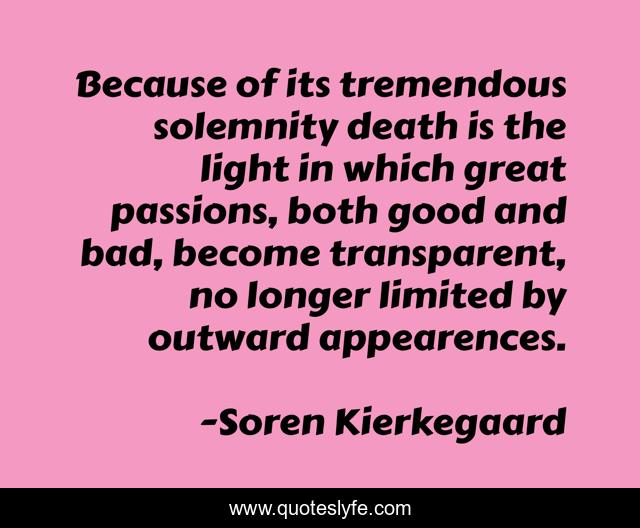 This page presents the quote "Because of its tremendous solemnity death is the light in which great passions, both good and bad, become transparent, no longer limited by outward appearences.". Author of this quote is Soren Kierkegaard. This quote is about light, great, good,.
