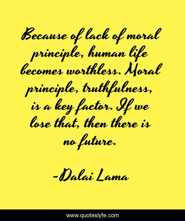 This page presents the quote "Because of lack of moral principle, human life becomes worthless. Moral principle, truthfulness, is a key factor. If we lose that, then there is no future.". Author of this quote is Dalai Lama. This quote is about life, moral, human,.