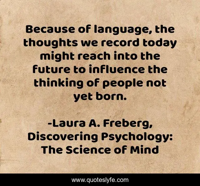 This page presents the quote "Because of language, the thoughts we record today might reach into the future to influence the thinking of people not yet born.". Author of this quote is Laura A. Freberg, Discovering Psychology: The Science of Mind. This quote is about science, psychology, language,.