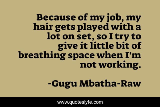 This page presents the quote "Because of my job, my hair gets played with a lot on set, so I try to give it little bit of breathing space when I'm not working.". Author of this quote is Gugu Mbatha-Raw. This quote is about hair, job, working,.