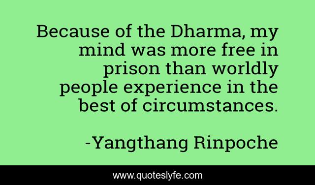 This page presents the quote "Because of the Dharma, my mind was more free in prison than worldly people experience in the best of circumstances.". Author of this quote is Yangthang Rinpoche. This quote is about freedom, mind, dharma, buddhism, prison, spirit,.