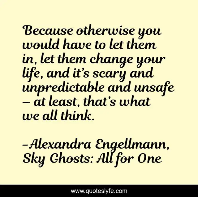 This page presents the quote "Because otherwise you would have to let them in, let them change your life, and it’s scary and unpredictable and unsafe – at least, that’s what we all think.". Author of this quote is Alexandra Engellmann, Sky Ghosts: All for One. This quote is about action, drama, romance, urban-fantasy, young-adult,.