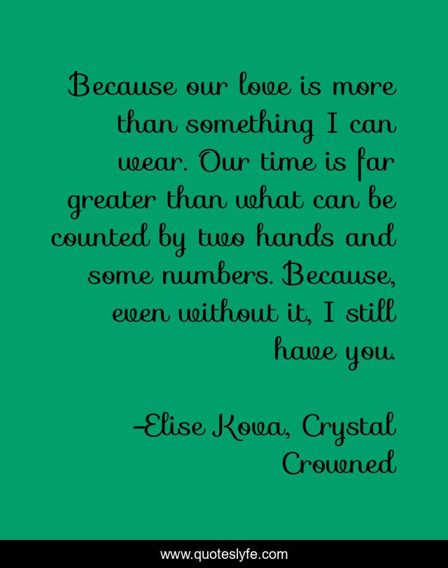 This page presents the quote "Because our love is more than something I can wear. Our time is far greater than what can be counted by two hands and some numbers. Because, even without it, I still have you.". Author of this quote is Elise Kova, Crystal Crowned. This quote is about relationships, love, affection,.