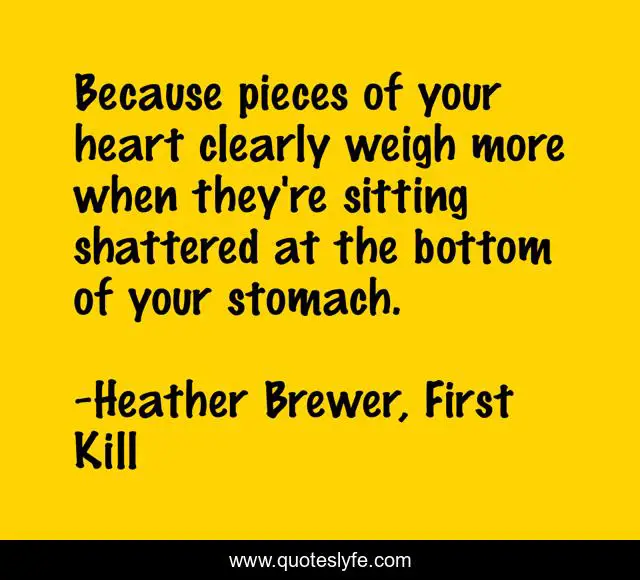 This page presents the quote "Because pieces of your heart clearly weigh more when they're sitting shattered at the bottom of your stomach.". Author of this quote is Heather Brewer, First Kill. This quote is about sadness, heartbreak, love, affection,.