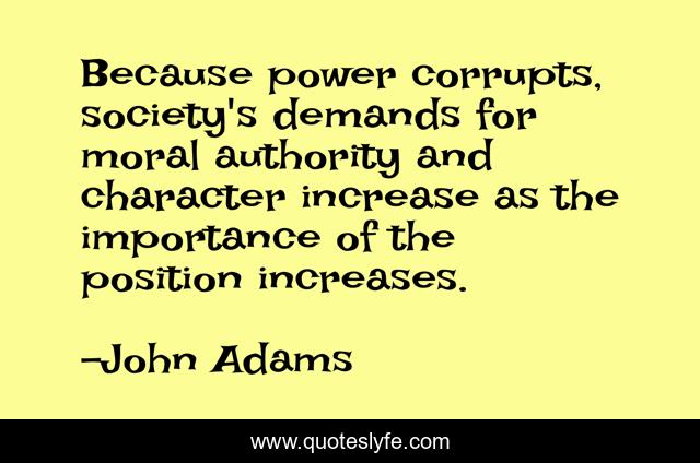 This page presents the quote "Because power corrupts, society's demands for moral authority and character increase as the importance of the position increases.". Author of this quote is John Adams. This quote is about society, character, moral,.
