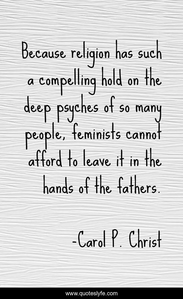 This page presents the quote "Because religion has such a compelling hold on the deep psyches of so many people, feminists cannot afford to leave it in the hands of the fathers.". Author of this quote is Carol P. Christ. This quote is about people, deep, hands,.