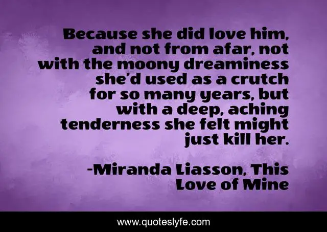 This page presents the quote "Because she did love him, and not from afar, not with the moony dreaminess she’d used as a crutch for so many years, but with a deep, aching tenderness she felt might just kill her.". Author of this quote is Miranda Liasson, This Love of Mine. This quote is about contemporary-romance, lighthearted,.
