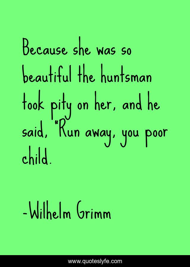 This page presents the quote "Because she was so beautiful the huntsman took pity on her, and he said, "Run away, you poor child.". Author of this quote is Wilhelm Grimm. This quote is about beautiful, pretty-girls, pretty,.