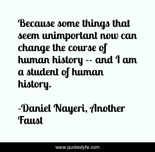 This page presents the quote "Because some things that seem unimportant now can change the course of human history -- and I am a student of human history.". Author of this quote is Daniel Nayeri, Another Faust. This quote is about humanity, history,.