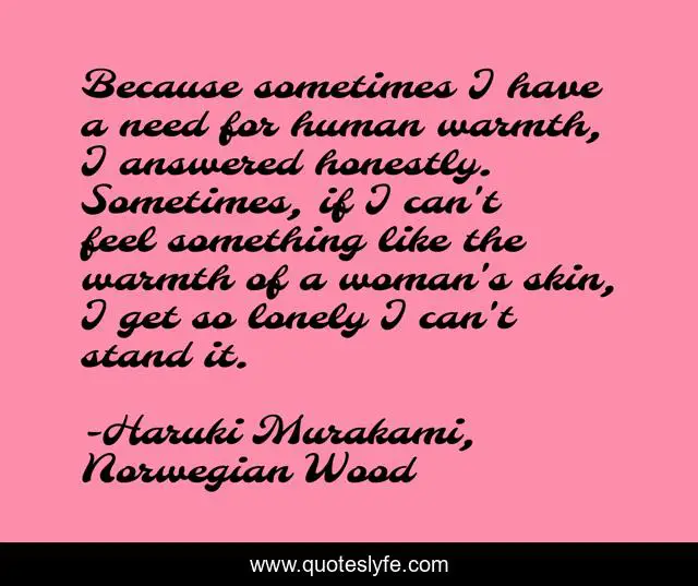 This page presents the quote "Because sometimes I have a need for human warmth, I answered honestly. Sometimes, if I can't feel something like the warmth of a woman's skin, I get so lonely I can't stand it.". Author of this quote is Haruki Murakami, Norwegian Wood. This quote is about books, book, norwegian-wood,.