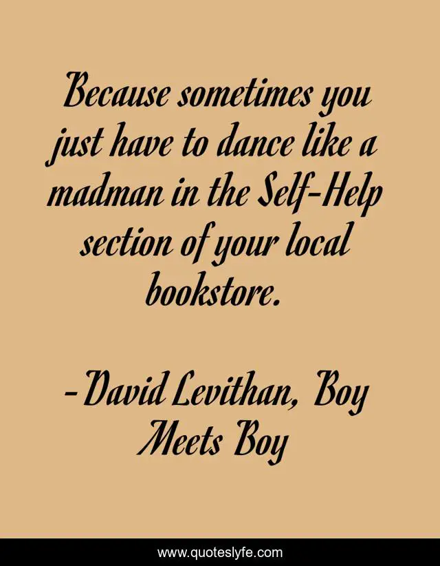This page presents the quote "Because sometimes you just have to dance like a madman in the Self-Help section of your local bookstore.". Author of this quote is David Levithan, Boy Meets Boy. This quote is about humor, boy_meets_boy,.