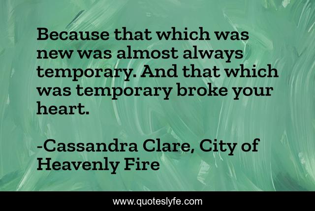 This page presents the quote "Because that which was new was almost always temporary. And that which was temporary broke your heart.". Author of this quote is Cassandra Clare, City of Heavenly Fire. This quote is about immortality, magnus,.
