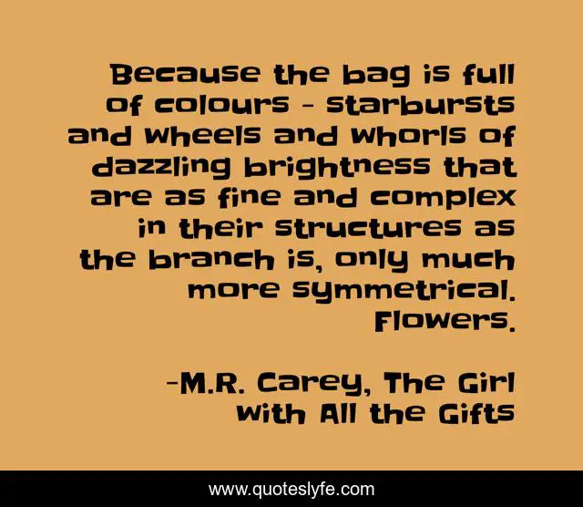This page presents the quote "Because the bag is full of colours - starbursts and wheels and whorls of dazzling brightness that are as fine and complex in their structures as the branch is, only much more symmetrical. Flowers.". Author of this quote is M.R. Carey, The Girl with All the Gifts. .