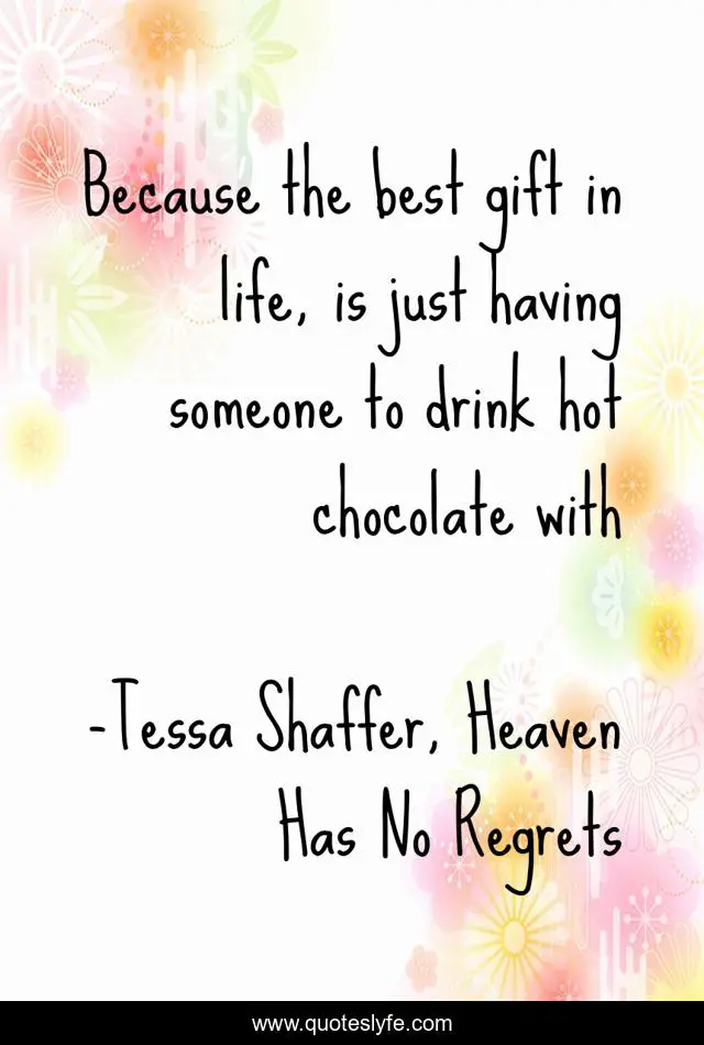 This page presents the quote "Because the best gift in life, is just having someone to drink hot chocolate with". Author of this quote is Tessa Shaffer, Heaven Has No Regrets. This quote is about christmas, life, hot-chocolate, life-lesson, gift-of-heaven, gift-of-life, book, no-regrets, holiday-gifts,.