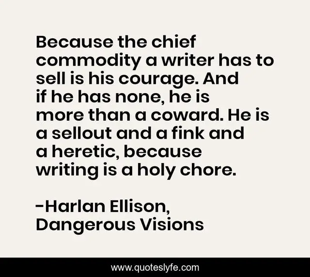 This page presents the quote "Because the chief commodity a writer has to sell is his courage. And if he has none, he is more than a coward. He is a sellout and a fink and a heretic, because writing is a holy chore.". Author of this quote is Harlan Ellison, Dangerous Visions. This quote is about courage, writers, commodity,.