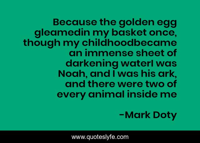 This page presents the quote "Because the golden egg gleamedin my basket once, though my childhoodbecame an immense sheet of darkening waterI was Noah, and I was his ark, and there were two of every animal inside me". Author of this quote is Mark Doty. .
