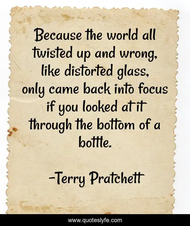 This page presents the quote "Because the world all twisted up and wrong, like distorted glass, only came back into focus if you looked at it through the bottom of a bottle.". Author of this quote is Terry Pratchett. This quote is about reality-of-life, alcohol, knurd,.