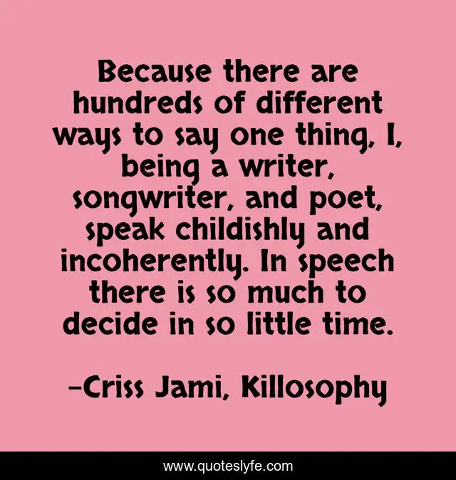 "Criss Jami, Killosophy Quotes." Quoteslyfe.com, 2025. Fri. 05 Dec. 2025. <https://www.quoteslyfe.com/quote/Because-there-are-hundreds-of-different-ways-28172>.