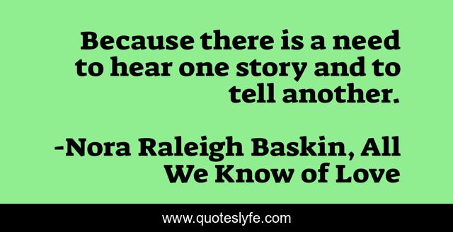 This page presents the quote "Because there is a need to hear one story and to tell another.". Author of this quote is Nora Raleigh Baskin, All We Know of Love. .