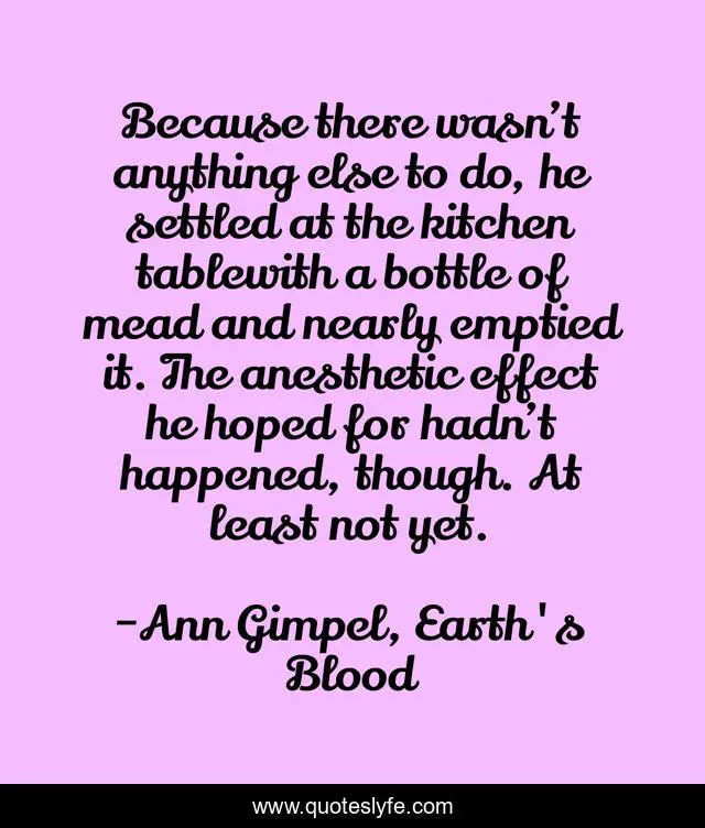 This page presents the quote "Because there wasn’t anything else to do, he settled at the kitchen tablewith a bottle of mead and nearly emptied it. The anesthetic effect he hoped for hadn’t happened, though. At least not yet.". Author of this quote is Ann Gimpel, Earth's Blood. This quote is about sci-fi, aliens, romance, fantasy, post-apocalyptic, speculative-fiction,.