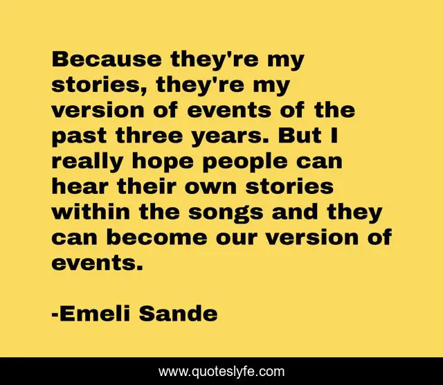 This page presents the quote "Because they're my stories, they're my version of events of the past three years. But I really hope people can hear their own stories within the songs and they can become our version of events.". Author of this quote is Emeli Sande. This quote is about past, three, people,.