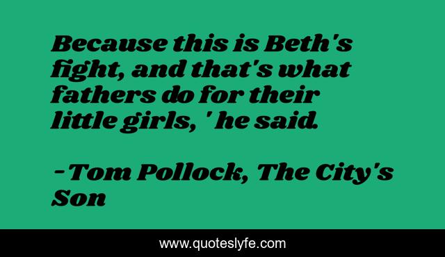 This page presents the quote "Because this is Beth's fight, and that's what fathers do for their little girls, ' he said.". Author of this quote is Tom Pollock, The City's Son. This quote is about heartbreaking, beth-bradley, father, father-daughter-relationship, mr-bradley,.