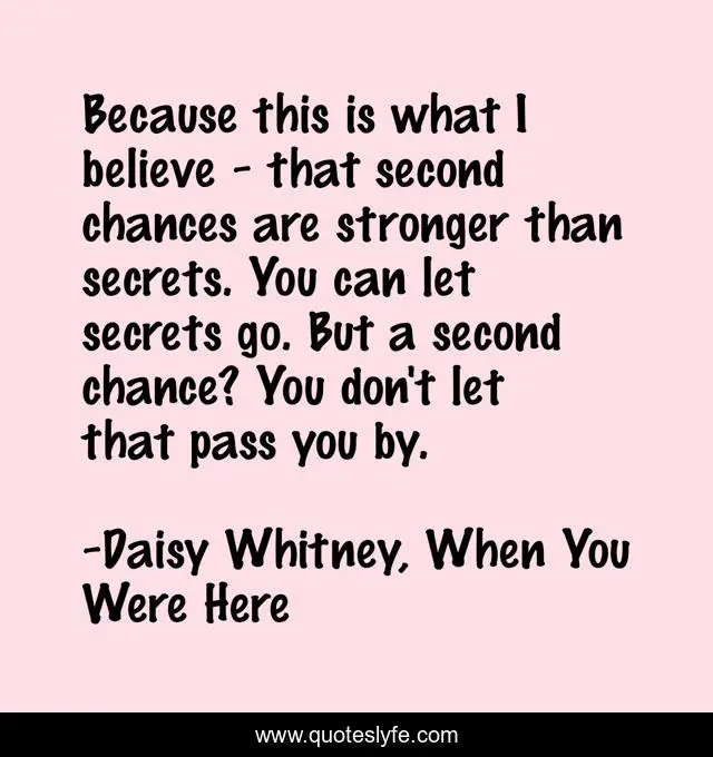 This page presents the quote "Because this is what I believe - that second chances are stronger than secrets. You can let secrets go. But a second chance? You don't let that pass you by.". Author of this quote is Daisy Whitney, When You Were Here. This quote is about love, secrets, second-chances, inspirational, enthusiasm, affection,.