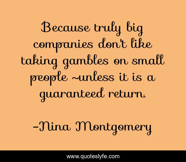 This page presents the quote "Because truly big companies don't like taking gambles on small people ~unless it is a guaranteed return.". Author of this quote is Nina Montgomery. .