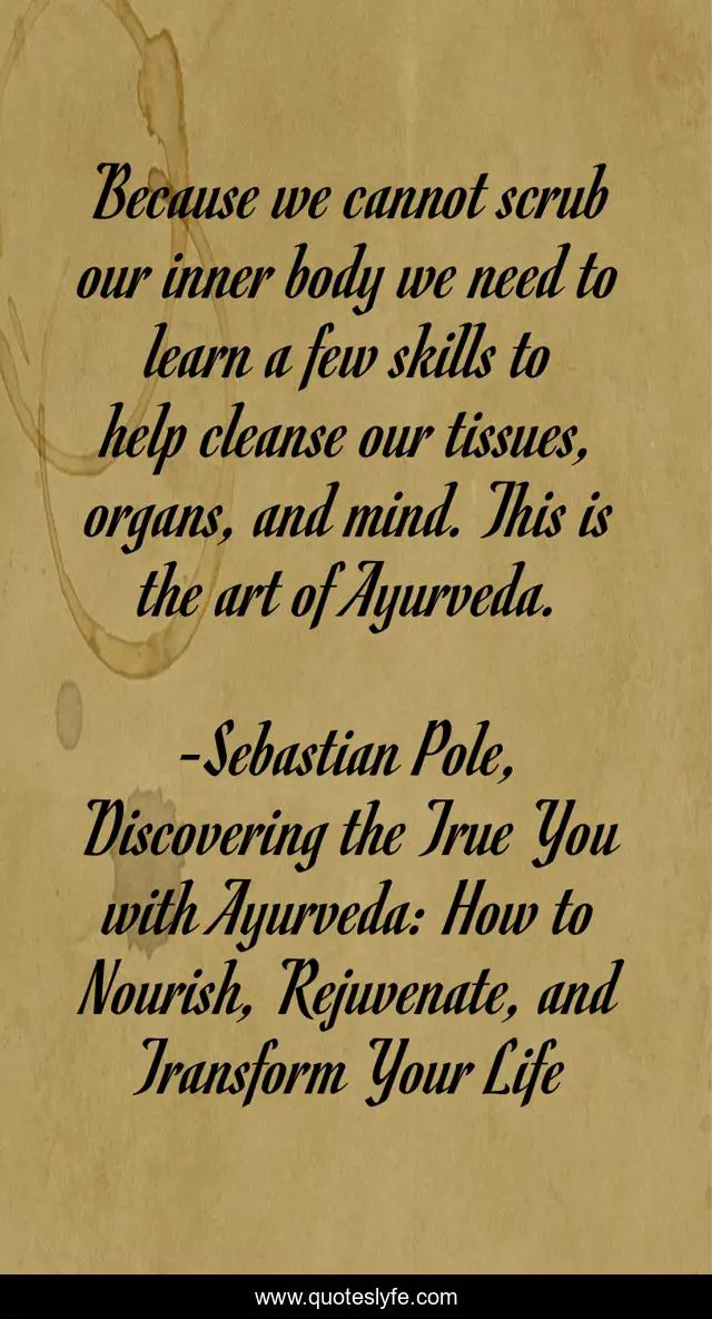 This page presents the quote "Because we cannot scrub our inner body we need to learn a few skills to help cleanse our tissues, organs, and mind. This is the art of Ayurveda.". Author of this quote is Sebastian Pole, Discovering the True You with Ayurveda: How to Nourish, Rejuvenate, and Transform Your Life. This quote is about yoga, healthy-living, alternative-therapy, ayurveda, stress-relief, herbs, health, wellness, herbal,.