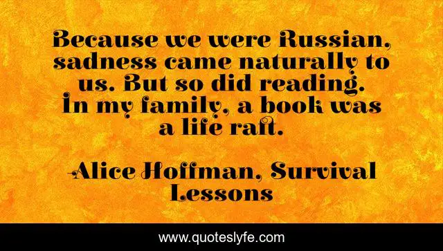 This page presents the quote "Because we were Russian, sadness came naturally to us. But so did reading. In my family, a book was a life raft.". Author of this quote is Alice Hoffman, Survival Lessons. This quote is about sadness, books, reading,.