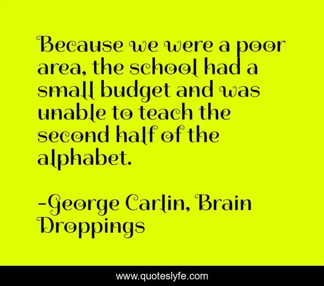 This page presents the quote "Because we were a poor area, the school had a small budget and was unable to teach the second half of the alphabet.". Author of this quote is George Carlin, Brain Droppings. This quote is about school, humor,.