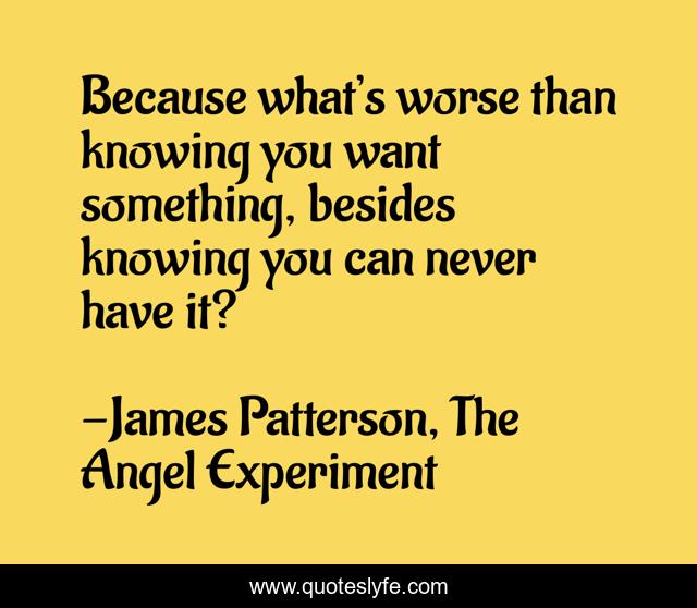 This page presents the quote "Because what’s worse than knowing you want something, besides knowing you can never have it?". Author of this quote is James Patterson, The Angel Experiment. This quote is about yearning, hopelessness, unrequited-love,.