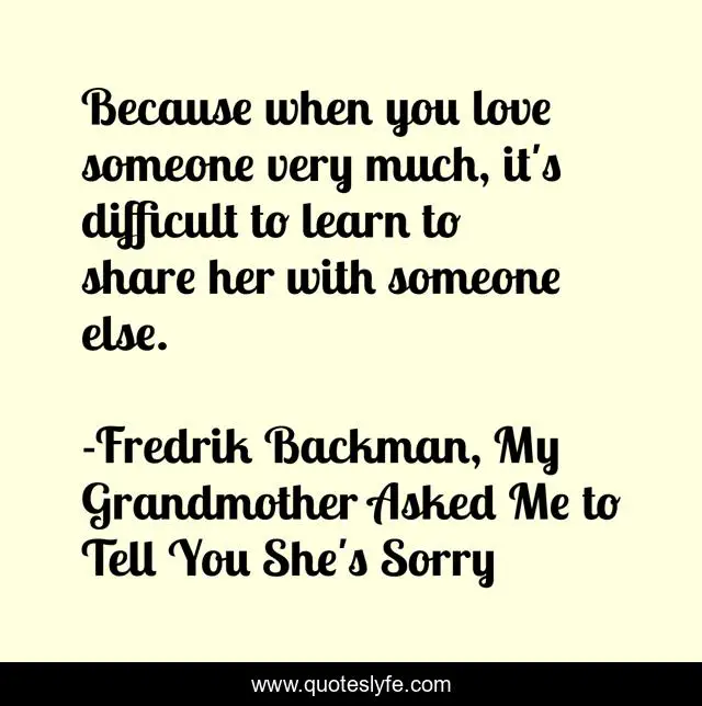 This page presents the quote "Because when you love someone very much, it's difficult to learn to share her with someone else.". Author of this quote is Fredrik Backman, My Grandmother Asked Me to Tell You She's Sorry. This quote is about sharing, tire, challenge, elsa, share, unconditional-love, granny, jealous, difficult,.