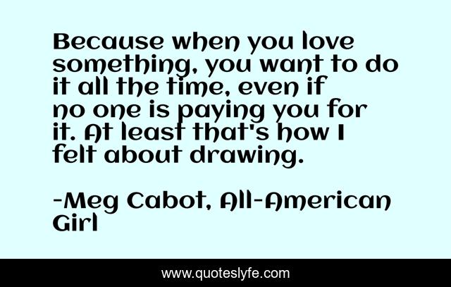 This page presents the quote "Because when you love something, you want to do it all the time, even if no one is paying you for it. At least that's how I felt about drawing.". Author of this quote is Meg Cabot, All-American Girl. This quote is about appreciaton, art, generosity, samantha,.