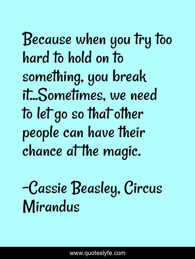 This page presents the quote "Because when you try too hard to hold on to something, you break it...Sometimes, we need to let go so that other people can have their chance at the magic.". Author of this quote is Cassie Beasley, Circus Mirandus. This quote is about inspriational, magic,.