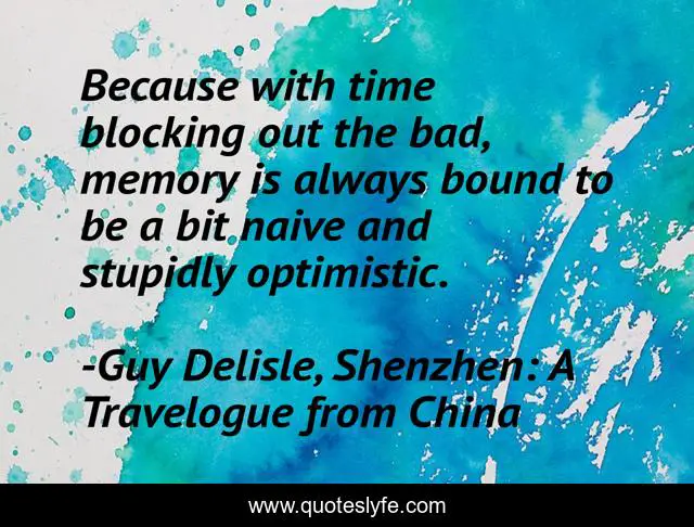 This page presents the quote "Because with time blocking out the bad, memory is always bound to be a bit naive and stupidly optimistic.". Author of this quote is Guy Delisle, Shenzhen: A Travelogue from China. This quote is about time-passing, memory,.