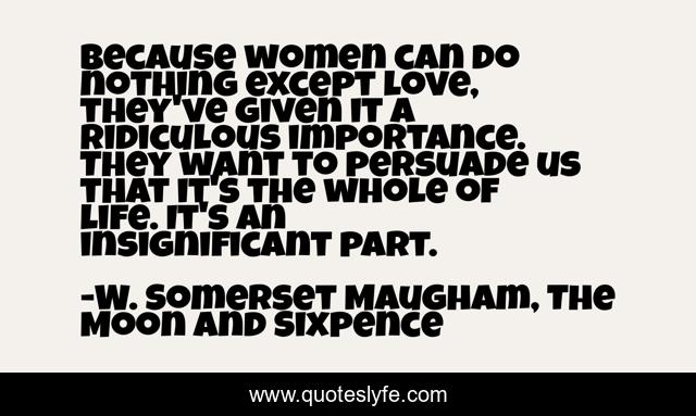 This page presents the quote "Because women can do nothing except love, they've given it a ridiculous importance. They want to persuade us that it's the whole of life. It's an insignificant part.". Author of this quote is W. Somerset Maugham, The Moon and Sixpence. This quote is about love, affection, women,.