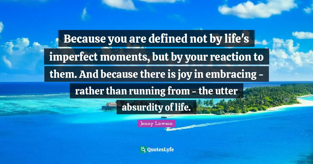 This page presents the quote "Because you are defined not by life's imperfect moments, but by your reaction to them. And because there is joy in embracing - rather than running from - the utter absurdity of life.". Author of this quote is Jenny Lawson. This quote is about absurdity of life, defined, life, joy, moments, imperfect, running,.