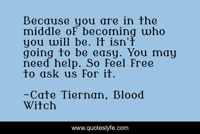 This page presents the quote "Because you are in the middle of becoming who you will be. It isn't going to be easy. You may need help. So feel free to ask us for it.". Author of this quote is Cate Tiernan, Blood Witch. This quote is about life-lessons, care,.