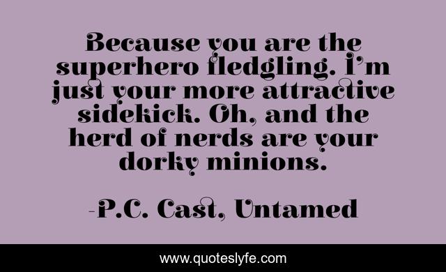 This page presents the quote "Because you are the superhero fledgling. I’m just your more attractive sidekick. Oh, and the herd of nerds are your dorky minions.". Author of this quote is P.C. Cast, Untamed. This quote is about romance, aphrodite, young-adult, fantasy, zoey,.