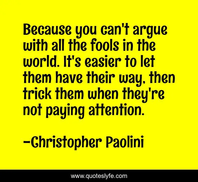 This page presents the quote "Because you can't argue with all the fools in the world. It's easier to let them have their way, then trick them when they're not paying attention.". Author of this quote is Christopher Paolini. This quote is about common-sense, humor, smart,.