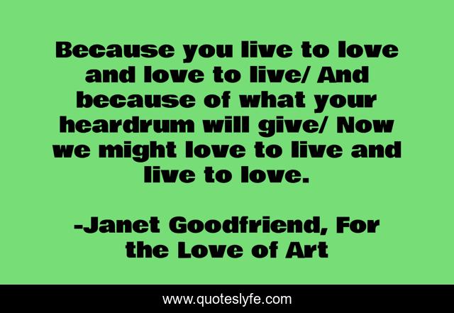 This page presents the quote "Because you live to love and love to live/ And because of what your heardrum will give/ Now we might love to live and live to love.". Author of this quote is Janet Goodfriend, For the Love of Art. This quote is about environment, school, art, martha-s-vineyard, heist, debut, character, book-club, community,.