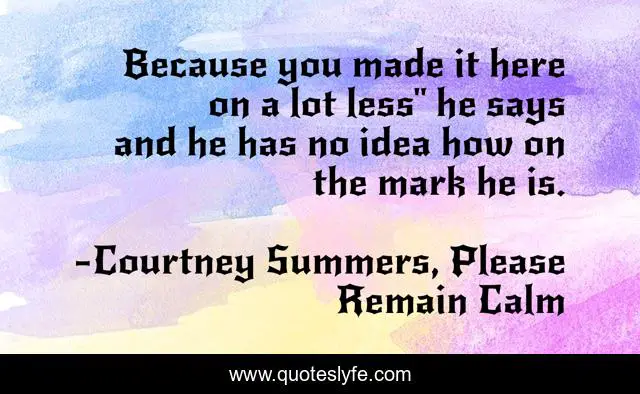 This page presents the quote "Because you made it here on a lot less" he says and he has no idea how on the mark he is.". Author of this quote is Courtney Summers, Please Remain Calm. This quote is about courage, tenacity,.