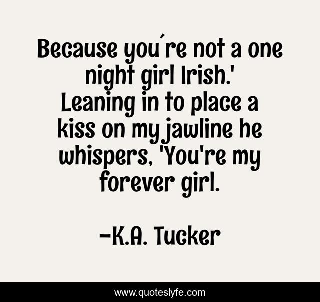 This page presents the quote "Because you´re not a one night girl Irish.' Leaning in to place a kiss on my jawline he whispers, 'You're my forever girl.". Author of this quote is K.A. Tucker. This quote is about ashton-henley, forever, love, affection, inlove,.