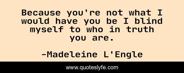 This page presents the quote "Because you're not what I would have you be I blind myself to who in truth you are.". Author of this quote is Madeleine L'Engle. This quote is about realistic, expectations,.