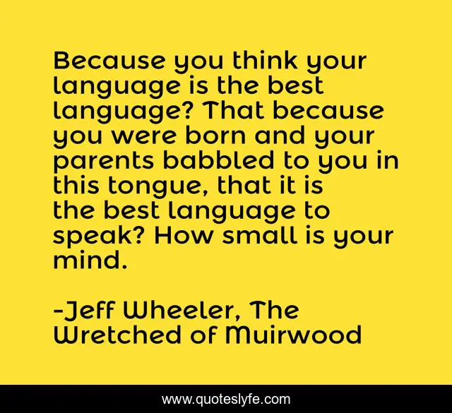 This page presents the quote "Because you think your language is the best language? That because you were born and your parents babbled to you in this tongue, that it is the best language to speak? How small is your mind.". Author of this quote is Jeff Wheeler, The Wretched of Muirwood. .