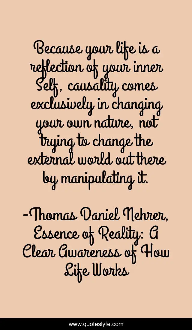 This page presents the quote "Because your life is a reflection of your inner Self, causality comes exclusively in changing your own nature, not trying to change the external world out there by manipulating it.". Author of this quote is Thomas Daniel Nehrer, Essence of Reality: A Clear Awareness of How Life Works. This quote is about body-mind-spirit, philosophy, consciousness,.
