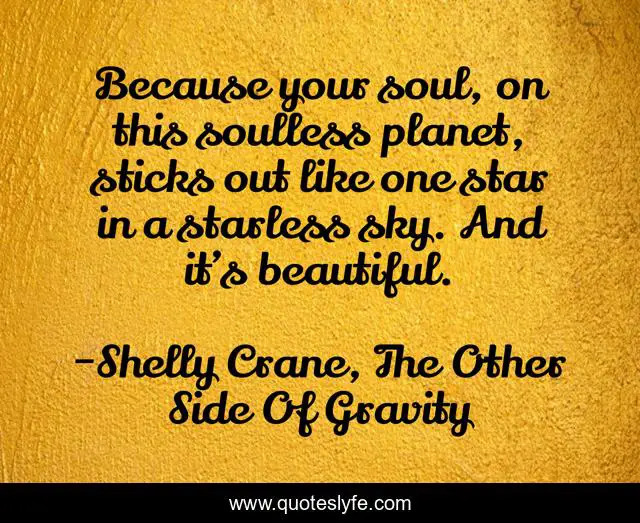 This page presents the quote "Because your soul, on this soulless planet, sticks out like one star in a starless sky. And it’s beautiful.". Author of this quote is Shelly Crane, The Other Side Of Gravity. This quote is about fate, young-adult-romance, sci-fi, science-fiction-romance,.